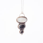 A lovely combination of light and dark stones bring a sense of balance in this piece. Dark black onyx and bright moonstone cabochons are set in sterling silver with  ball details and a brushed patina finish