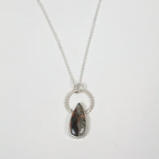 Grayscale ribbons with a pop of rust and peach of a Maligano Jasper sit in a brushed Sterling Silver bezel setting with a textured halo.