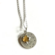A tiny triangle tourmaline stone set with prongs and space motifs stamped all around.