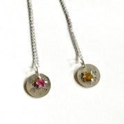 A tiny triangle tourmaline stone set with prongs and garden motifs stamped all around.