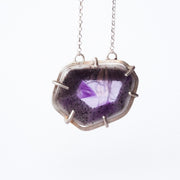 Amethyst slices with a heavy sterling silver frame and prong setting. This style allows the necklace to be worn two ways because I simply couldn't choose which side was prettier.